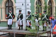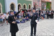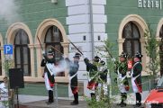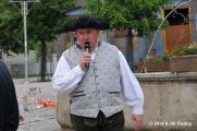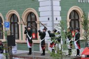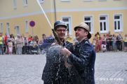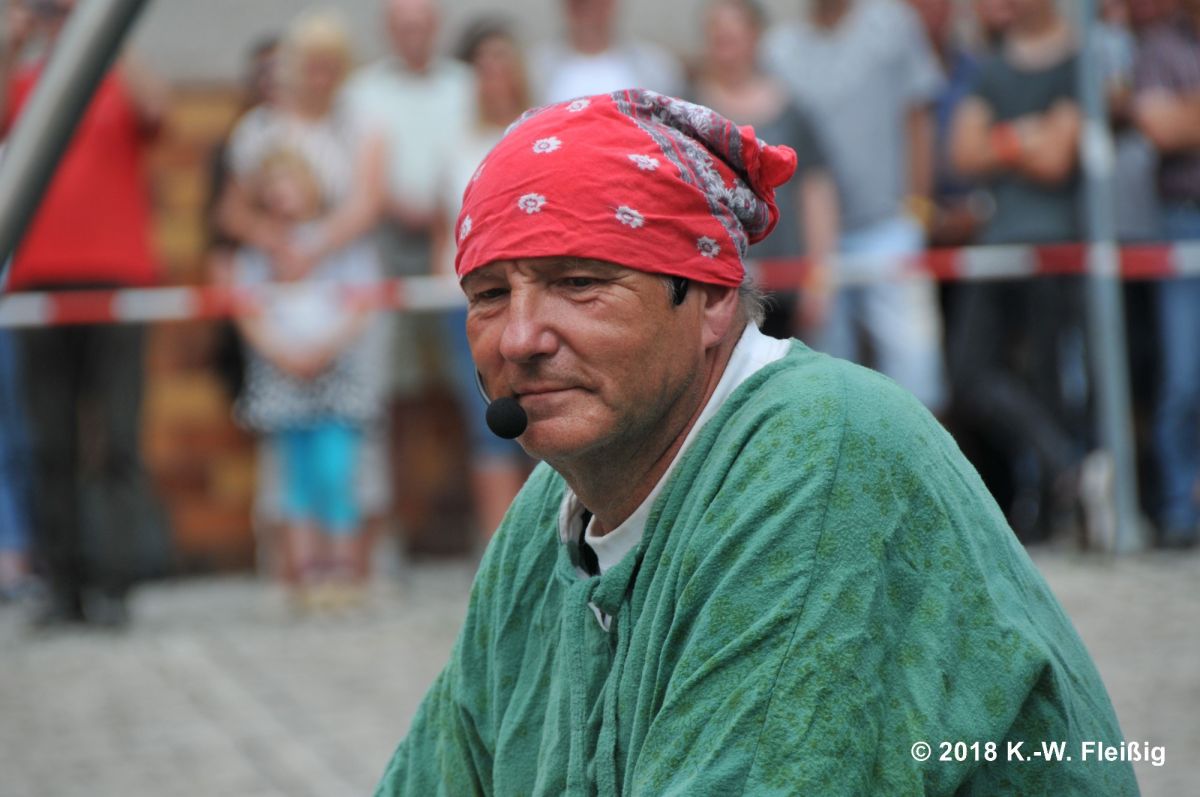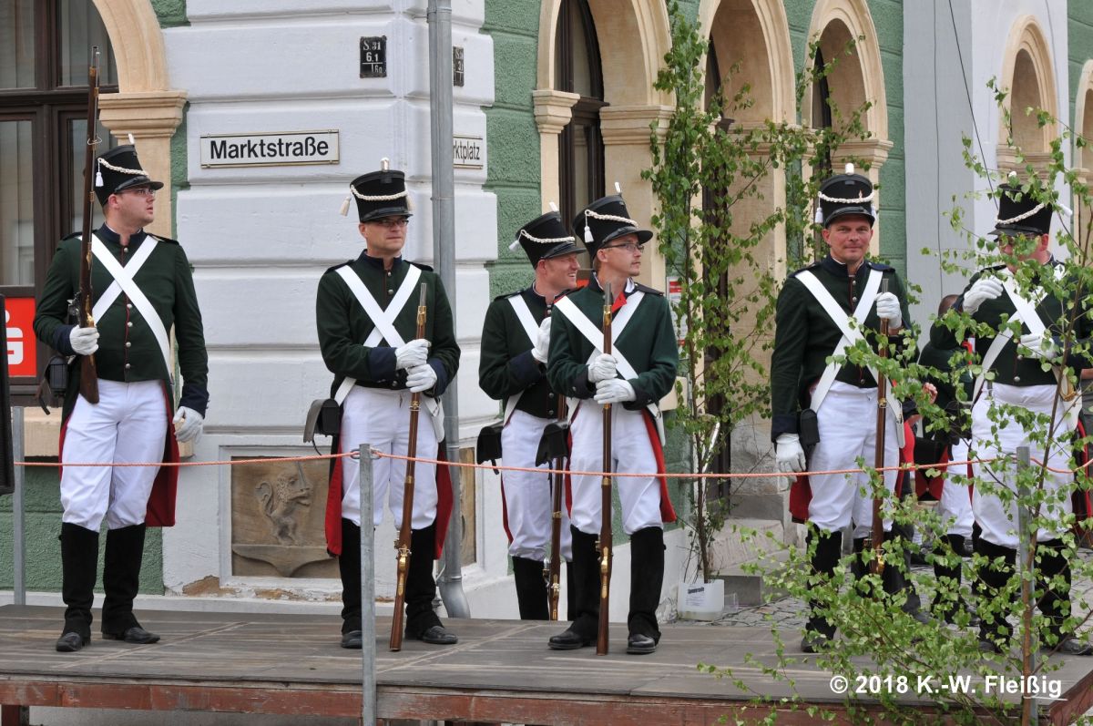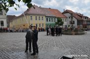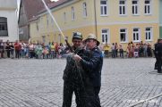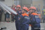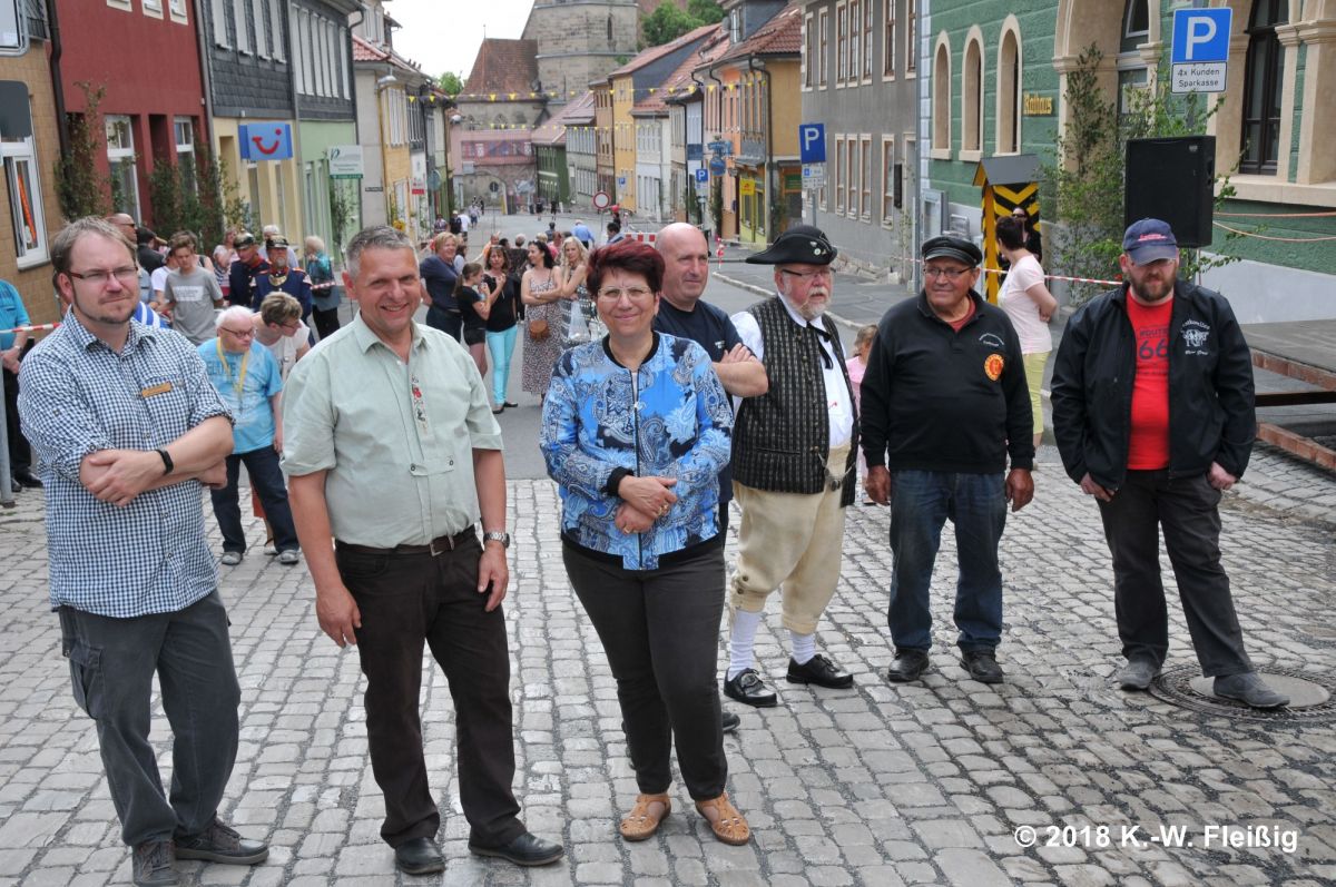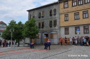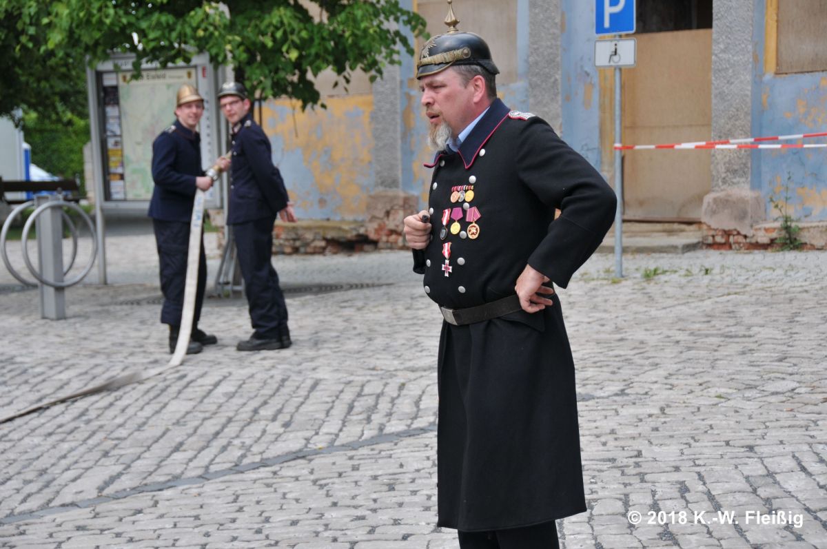 In diesem Jahr ertönte allerdings nicht wie üblich die Sirene zur Eröffnung der Feuerwehrübung. Die Gäste auf dem Marktplatz erwartete eine realitätsnahe Alarmierung wie sie schon vor hunderten Jahren in Eisfeld üblich war. Der Turmbläser auf dem Schloßturm verkündete mit seiner Fanfare ein Feuer. Die Alarmierungskette nimmt nun seinen Lauf. Die Trommler alarmieren die Löschmannschaften im Stadtgebiet, ebenso wird die Alarmkanone am Stelzener Berg in Stellung gebracht. (Hier "dargestellt" von der Stadtwache mit ihren neuen Gewehren) Ein Schuss-Überland (Coburg,Sonneberg,Hildburghausen) Zwei Schüsse-Umland (Harras, Waffenrod, Brünn, Lautertal) Drei Schüsse-In der Stadt brennt es !!!