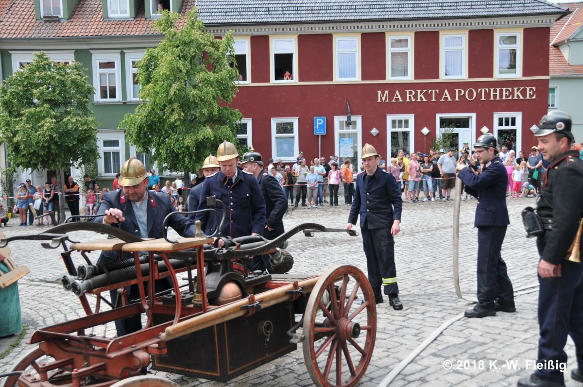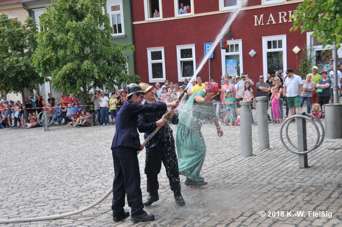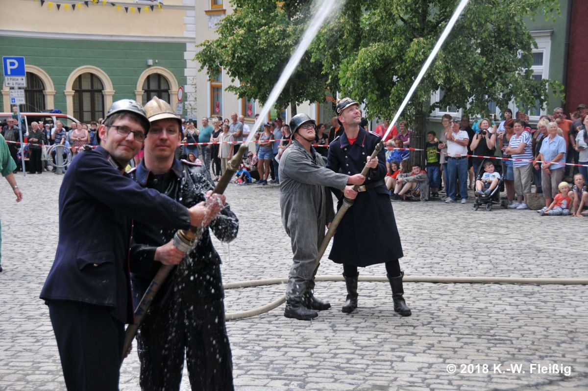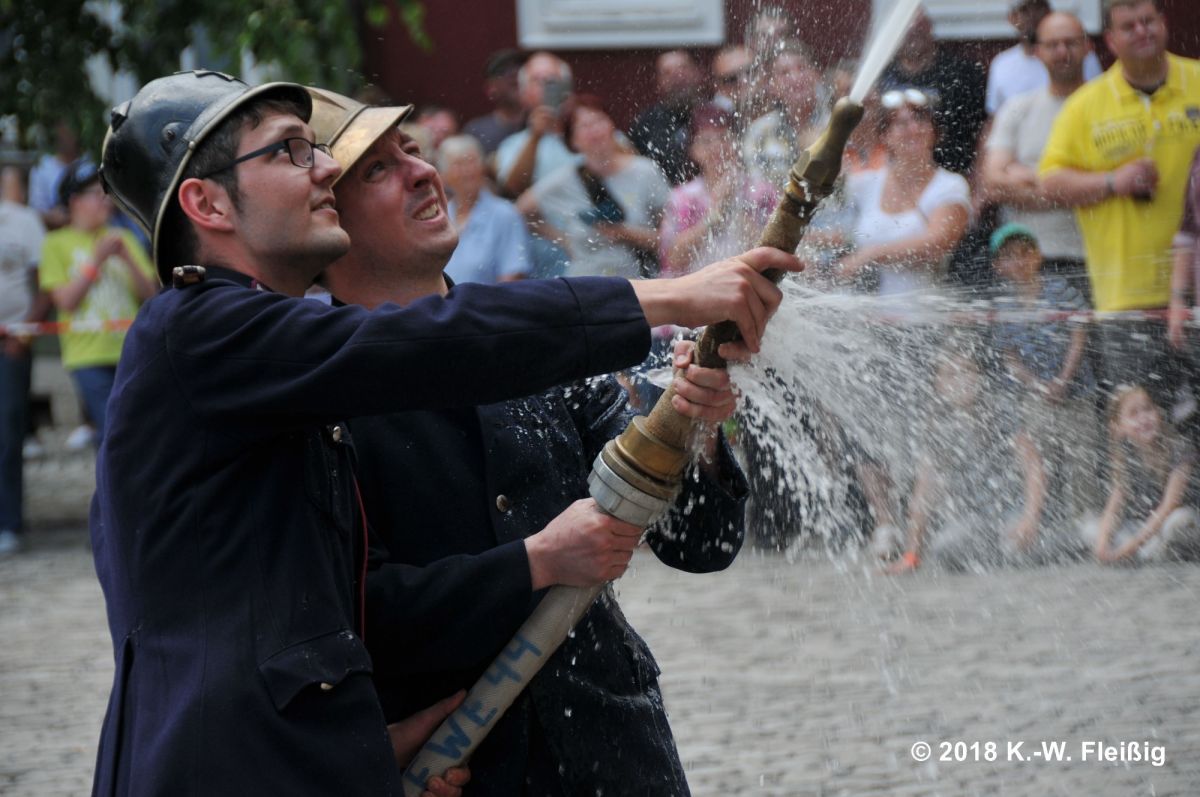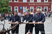 Die Löschmannschaft der Spritze legt am Marktbrunnen an und bekämpft den Brand im Deutschen Haus. Wussten sie schon...?