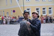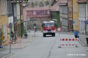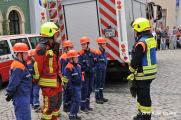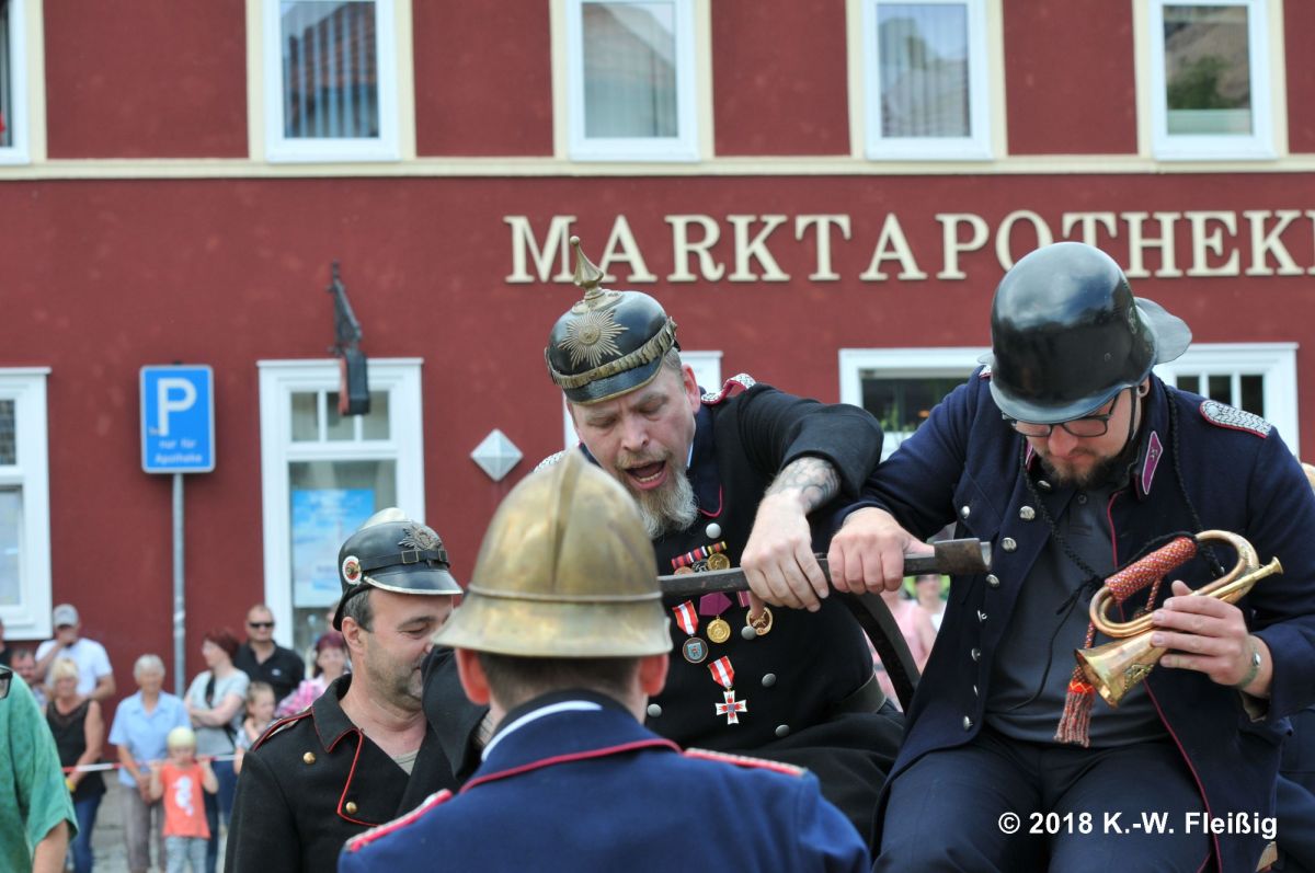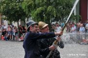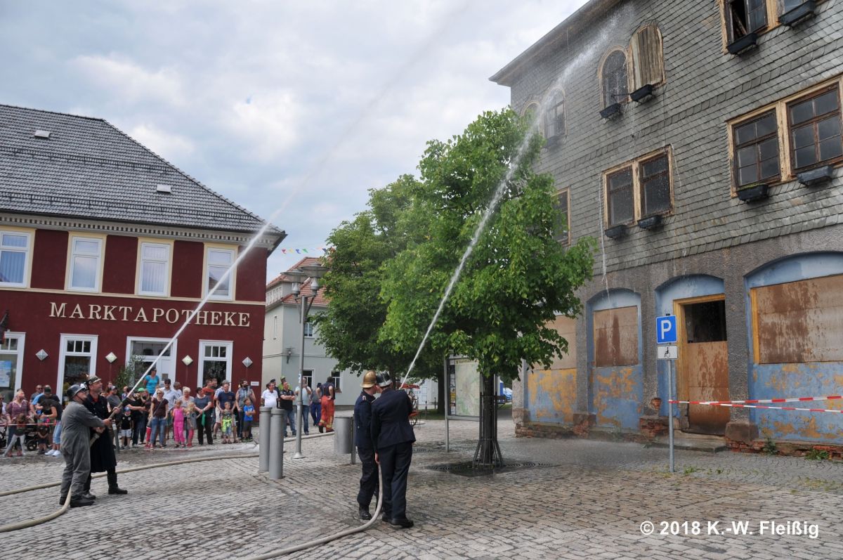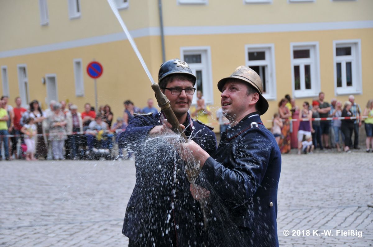 Die Löschmannschaft der Spritze legt am Marktbrunnen an und bekämpft den Brand im Deutschen Haus. Wussten sie schon...?