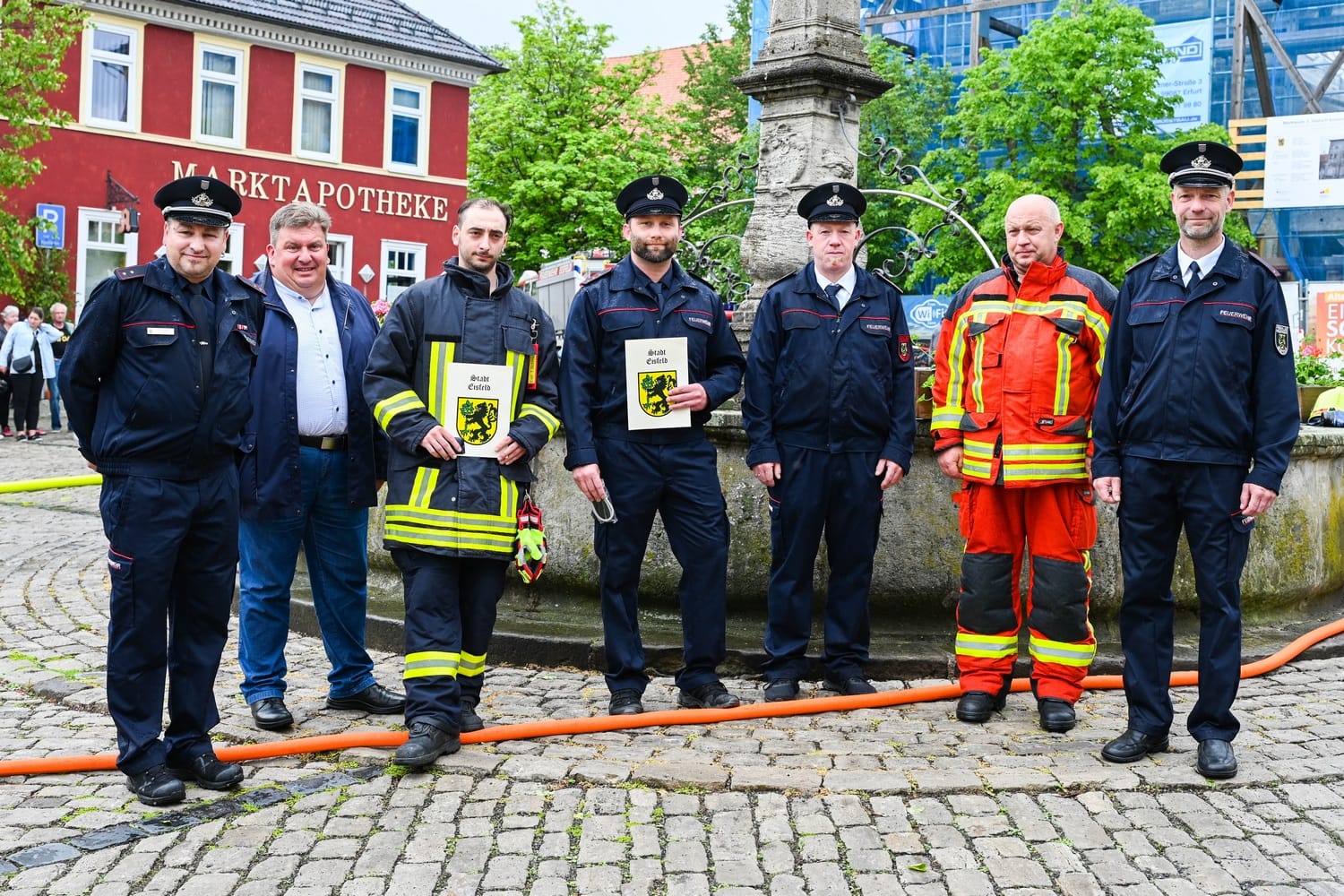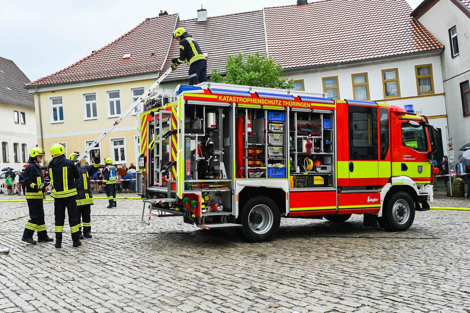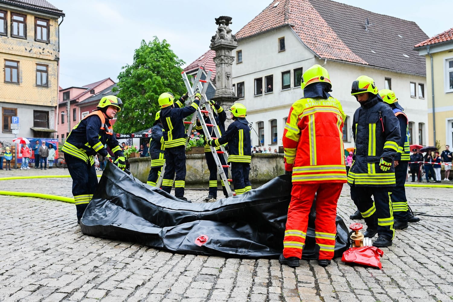 Auch in diesem Jahr fand zum Eisfelder Kuhschwanzfest eine Schauübung der Feuerwehr Eisfeld auf dem Marktplatz statt. Trotz Starkregen und Unwetterwarnung, wurde beim Eisfelder Kuhschwanzfest am Programmablauf festgehalten. Die Feuerwehr und Jugendfeuerwehr Eisfeld führten um 14.00 Uhr ihre Schauübung auf dem Eisfelder Marktplatz vor. Thema war diesmal die Vorstellung des neuen LF20-KATSCHUTZ und dessen Möglichkeiten speziell im Bereich Waldbrand-Schutz. Im Anschluss an die Übung wurden traditionell neue Kameradinnen und Kameraden in die Jugendfeuerwehr aufgenommen, Auszeichnungen und Beförderungen überreicht.