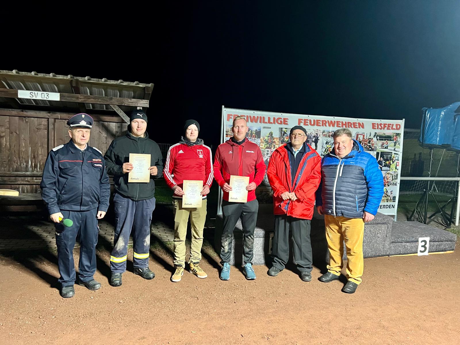 Am 2. Oktober fand nach dem großen Erfolg des vergangenen Jahres erneut der Pokalwettkampf im Löschangriff Nass in Eisfeld statt. Leider konnen die Kameraden auf Schleusingen wieder keine Austragungsstätte für diese (ihre) Veranstaltung finden. Deshalb sprangen die KameradInnen und der Feuerwehrverein aus Eisfeld ein. Gemeinsam mit dem Feuerwehr-Kreisverband und den Kamerdinnen und Kameraden des THW Suhl, die wieder die Beleuchtung übernahmen, wurde diese Veranstaltung organisiert und durchgeführt. Ausgeschrieben waren der Kreismeister und der Wanderpokal des Bürgermeisters der Stadt Eisfeld in der DIN-Klasse und der Wanderpokal des Landkreises in der TGL-Klasse. Insgesamt traten 12 Mannschaften in der DIN und 8 Mannschaften in der TGL Wertung an. Diese große Teilnehmerzahl erfreute die Veranstalter, auch wenn man natürlich bei einem nächsten Mal auf eine weitere Steigerung hofft. Es wurden folgende Ergebnisse erzielt: