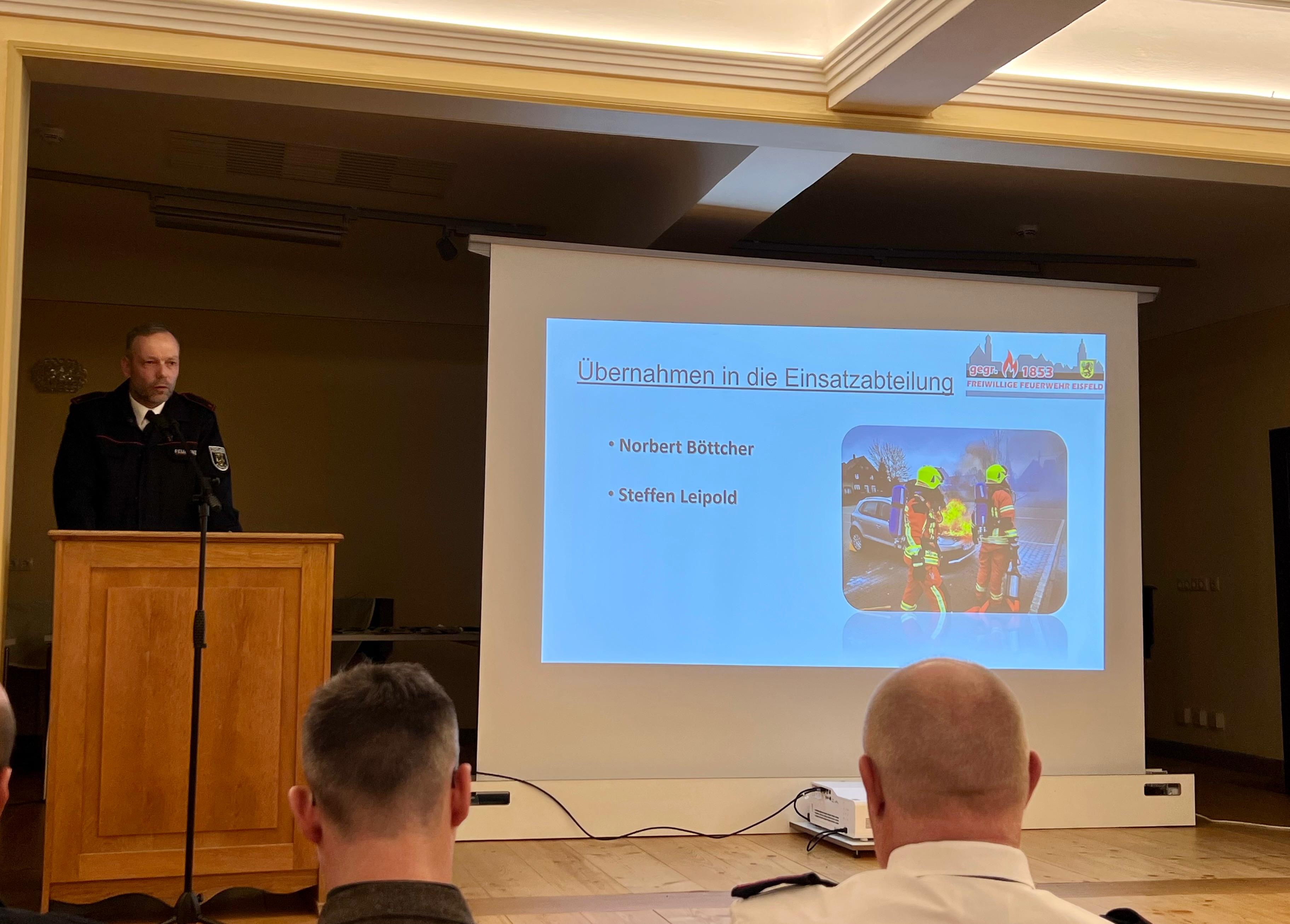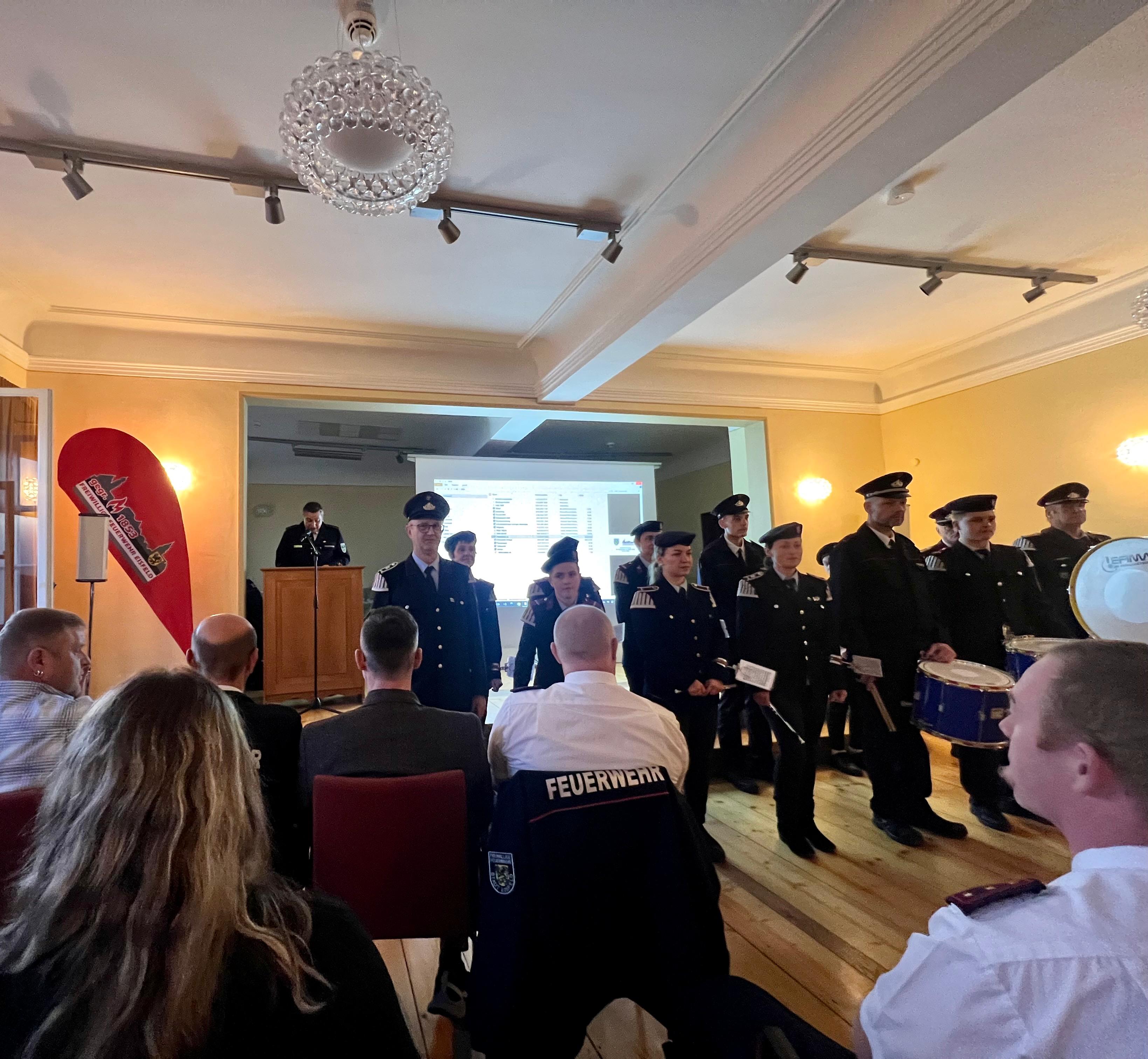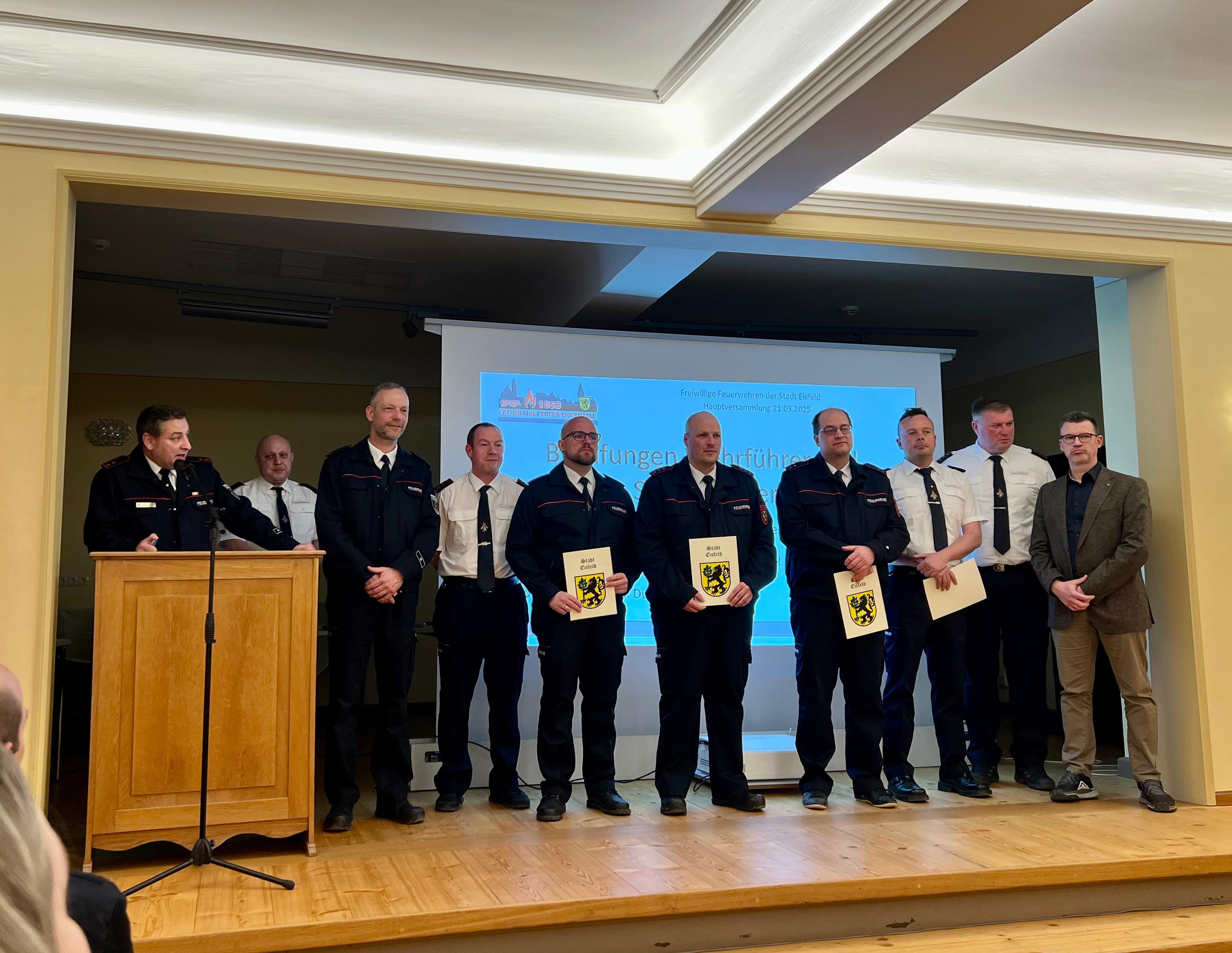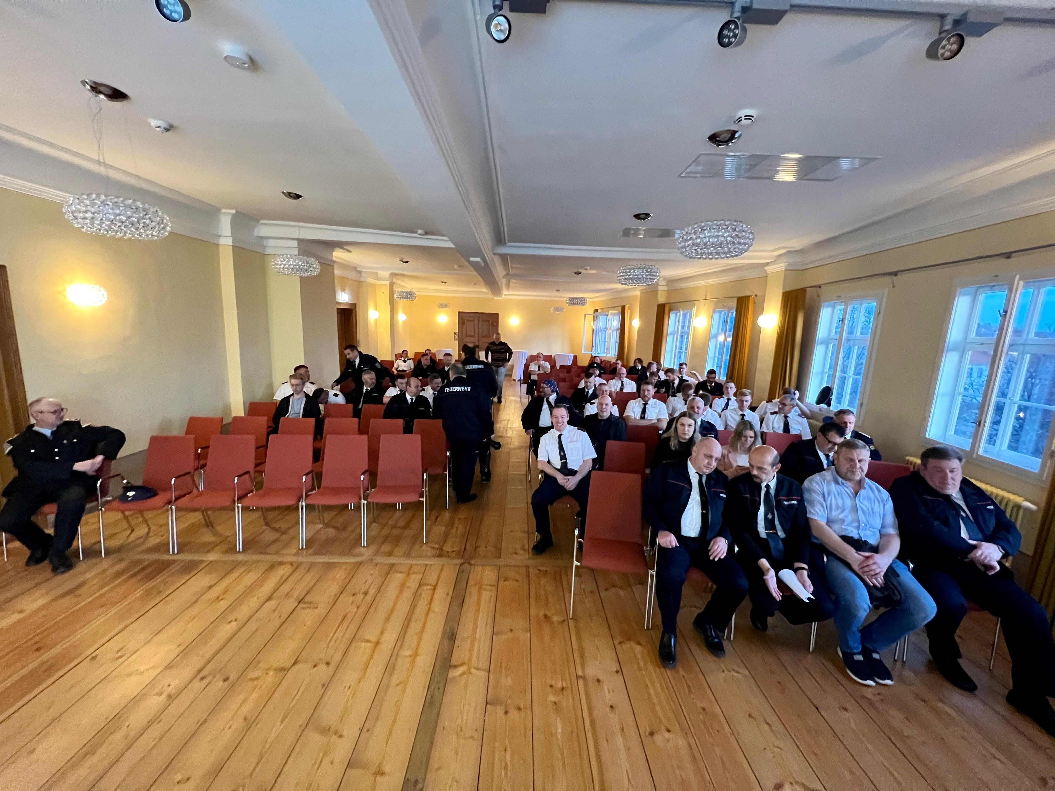im angemessenen Ambiente der Eisfelder Schlosses trafen sich die Mitglieder der Freiwilligen Feuerwehren der Stadt Eisfeld, um sich die Rechenschaftsberichte des Stadtbrandmeisters, der Wehrführer und der Jugendwarte anzuhören. Unter den Anwesenden befand sich auch unser Bürgermeister Christoph Bauer, Landrat Sven Gregor, Vertreter des Stadtrates, sowie als Vertreter des Landratsamtes Marcel Koch. Ein ereignissreiches Jahr liegt hinter uns und der Dank aller Redner ging an die Kameradinnen und Kameraden, sowie deren Angehörige. Zusammengefasst leisteten die Eisfelder Feuerwehren mit all ihren Abteilungen über 7000 Stunden ehrenamtliche Arbeit für die Allgemeinheit. Bei 129 Einsätzen konnte vielen Bürgerinnen und Bürgern geholfen werden - dafür sind wir da - dafür machen wir freiwillig diese Arbeit. Details können im Jahresbericht 2024 nachgelesen werden, der hier auf unserer Web-Seite in Kürze veröffentlicht wird. Die Jahreshauptversammlung wurde tratitionell auch genutzt, um verdiente Kameradinnen und Kameraden auszuzeichnen und zu befördern. Allen einen Großen Dank auch noch einmal von dieser Stelle aus.