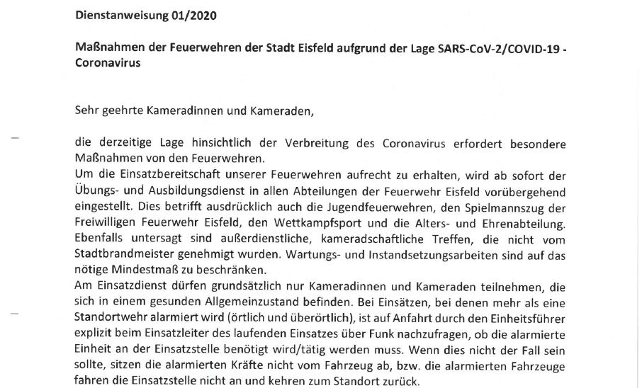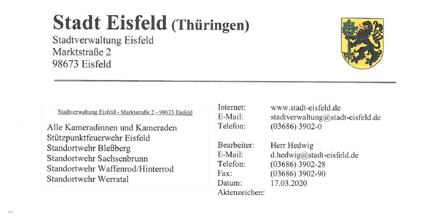 Auf Grund der Erlasse des Landes Thüringen und des Landkreises Hildburghausen verbot unser Stadtbrandmeister in Absprache mit dem Bürgermeister alle Feuerwehraktivitäten.